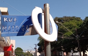 A placa mostra a sinalização na esquina da av. Manoel Mendes de Camargo com a rua Mato Grosso. Agora a pergunta que não quer calar: como o assento de vaso sanitário foi parar aí?...