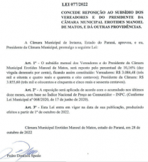 Os vereadores de Iretama tiveram reajuste de 10,16% em seus subsídios.