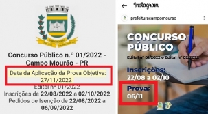 E a prova objetiva do concurso da prefeitura de Campo Mourão, que dia será? Tem candidato em dúvida por aí. É que uma publicação antiga no Instagram da prefeitura fala em 6 de novembro, enquanto o site da Fundação Fafipa crava dia 27. Calma. Seis de novembro era uma previsão inicial (Boca Santa também publicou esta data), mas a confirmação ficou mesmo para o dia 27. Inclusive, o local e o horário da prova serão divulgados no próximo dia 16.