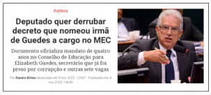 O deputado federal Rubens Bueno, ex-prefeito de Campo Mourão, foi destaque nesta quinta-feira no site da revista Veja. Motivo? Apresentou projeto para derrubar o decreto que nomeou nove integrante do Conselho Nacional da Educação. Umas das nomeadas - Elizabeth Regina Nunes Guedes- é irmã do ministro da Economia, Paulo Guedes. Bueno fala em nepotismo e falta do requisito de reputação totalmente ilibada.