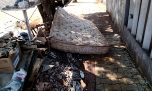 Colchão e entulhos deixados em calçada na rua Araruna, centro de Campo Mourão.