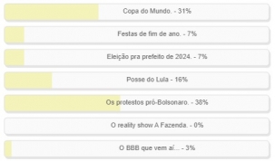 "Agora que passou a eleição presidencial, qual é o asssunto da vez?" Resposta: "Os protestos pro-Bolsonaro". Pelo menos foi essa a alternativa mais votada em enquete encerrada neste domingo. Teve 38% dos votos. Superou a "Copa do Mundo", que teve 31%. "A posse do Lula" ficou em terceiro, com 16%. O resultado completo está no quadro acima.
