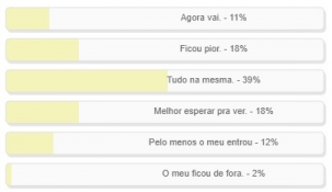 "O que você achou dos deputados eleitos este ano?" Enquete encerrada neste domingo deu vitória à alternativa "Tudo na mesma", com 39% dos votos. "Melhor esperar para ver" e "ficou pior" empataram na segunda posição, com 18%. "Pelo menos o meu entrou" teve 12%. O resultado completo está no quadro acima.