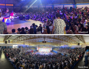 Ginásio de esportes de Terra Boa lotado nesta terça-feira para o espetáculo "Palhaços Cantores do Sou Arte". O mesmo já tinha acontecido na véspera em Luiziana e Mamborê. O espetáculo da Associação Sou Arte reúne circo, teatro, dança e música. A turnê é uma realização do Ministério do Turismo, através da Lei de Incentivo à Cultura.