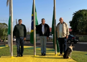 O clic é desta quinta-feira, em Fênix, durante a solenidade cívica que abriu a Semana da Pátria. O prefeito Neno Molina comandou o hasteamento das bandeiras. Na hora do hino um cachorro se juntou às autoridades. E cá para nós: é impressão ou o bicho também ficou em posição se sentido?...