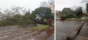 Av. Goioerê, perto da rua Rocha Pombo, na manhã desta quarta-feira. Vendaval da madrugada derrubou árvore que, por sua vez, derrubou poste e as duas pistas da avenida ficaram interditadas.