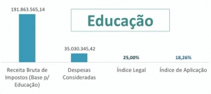 Saúde acima - No caso da saúde, os gastos de janeiro a agosto somaram R$ 33 milhões e representarem 17,5% das receitas, portanto, já acima do percentual mínimo legal, que é 15%.