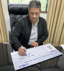 Olha o tamanho do cheque que o prefeito de Fênix, Neno Molina, assinou nesta terça-feira. Simbólico, é claro. Mas o valor é verdadeiro. Foi o repasse para a Apae local do renda do almoço servido durante a Caminhada Internacional na Natureza. O evento aconteceu no último dia 18. Rendeu R$ 4,5 mil, que vai ajudar no custeio da entidade.