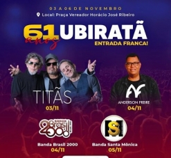 A prefeitura de Ubiratã divulgou a programação de aniversário do município, que completará 61 anos no dia 4 de novembro. A atração artística principal será o show do grupo Titãs. no dia 3. A programação tem ainda shows nos dias 4 e 5, todos em praça pública, Festival do Chopp todos os dias e encerramento, no dia 6, com a Festa do Leitão à Campestre, o prato típico do município.