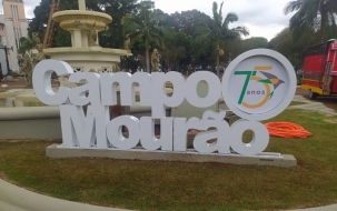 O chafariz da praça Getúlio Vargas agora conta com um letreiro com o nome da cidade - "Campo Mourão". A ideia é que ele fique permanentemente por lá. Apenas o círculo, onde hoje está a logomarca dos 75 anos do município, seria trocado ano a ano.