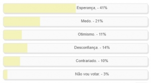 "Você vai votar (votou) este ano com qual sensação?" Enquete encerrada neste domingo deu vitória à alternativa "Esperança", com 41% dos votos. "Medo" teve 21% e "Desconfiança" 14%. O resultado completo está no quadro acima.