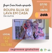 O grupo Cueca Virada apresenta sexta e sábado (20h), na Casa da Cultura, a peça "Roupa suja se lava na casa... da outra!". A entrada é gratuita. O espetáculo narra o encontro de duas amigas que não se falam há mais de 50 anos, graças a uma desavença motivada pelo casamento de ambas com um jardineiro chamado Florisberto.