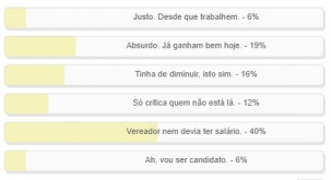 "O que achou do salário de R$ 12.500 para os vereadores que se elegerem em 2024 em Campo Mourão?" Enquete teve votação encerrada neste domingo. Venceu, com 40% dos votos, a alternativa "Vereador nem devia ter salário". Em segundo, com 19%, ficou "Absurdo. Já ganham bem hoje". Outros 16% votaram em "Tinha de diminuir, isto sim". O resultado completo está no quadro acima.