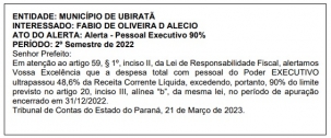 A prefeitura encerrou o segundo semestre de 2022 comprometendo acima de 48,6% da receita corrente líquida com a folha de pagamento. É o que diz uma publicação de alerta, nesta sexta-feira, do Tribunal de Contas do Estado. Não estourou o limite de 54% da Lei de Responsabilidade Fiscal, mas já requer atenação, daí o motivo do alerta.