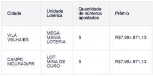 Números sorteados? 08, 12, 33 47 e 65.