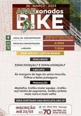 A OAB, a Apae e grupos de ciclistas de Campo Mourão promovem no próximo domingo o "Apaexonados por Bike". Será um pedal beneficente com percursos de 35 km e 50 km passando pelas margens do lago da usina Mourão. A inscrição custa R$ 70 e pode ser feita até quinta-feira. O lucro será repassado para a Apae Rural.