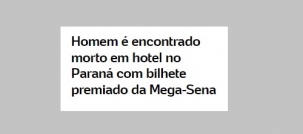 Virou notícia nacional, com direito a chamada na capa do portal UOL, a história do homem de 54 anos que morreu num hotel em Curitiba ao lado de um bilhete premiado da Mega Sena. Valor do prêmio: 398 mil. A princípio, a causa da morte foi infarto. Segundo a Tribuna do Interior, trata-se de José Aparecido Monteiro, que foi morador de Campo Mourão. O enterro, inclusive, foi marcado para a manhã deste sábado no para o Cemitério Municipal São Judas Tadeu.