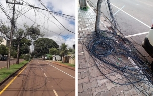 À esquerda, fiozeira na avenida após caminhão-baú passar arrebentando tudo, no fim de semana, próximo ao Prever. À direita, fiozeira em calçada na rua Harrison José Borges.