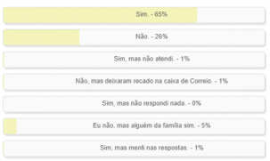Enquete com esta pergunta teve votação encerrada neste domingo. Resultado? 26% dos que responderam disseram que não foram visitados, não. Teve 1% que respondeu que recebeu a visita, mas não atendeu o recenseador. A maioria - 65% - confirmou a visita, além de 5% que foi na opção que alguém da família atendeu ao recenseador. O resultado completo está no quadro acima.