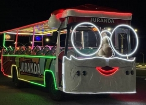 Juranda - A prefeitura tem o seu próprio "trenzinho" para passeio com as crianças no fim de ano. O ônibus adaptado ganhou até "cara de Papai Noel". O novo visual foi postado pela prefeita Leila Amadei.