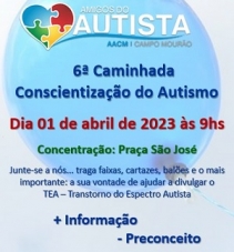 1) Acontece neste sábado (9h), em Campo Mourão, a 6ª Caminhada de Conscientização do Autismo. A concentração será na praça São José. O evento marca o Dia Mundial do Autismo (2 de abril).