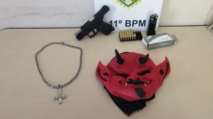 Um homem de máscara foi visto andando de carro em frente a escola de Farol. A Polícia Militar foi acionada, fez a abordagem e acabou descobrindo que o "mascarado" portava uma pistola e munições. Resultado: foi levado para a delegacia de Campo Mourão. Detalhe: a máscara faz alusão ao demônio e o homem, de 45 anos, morador de Engenheiro Beltrão, disse ser de "religião satanista" e que se tratava de um "amuleto".