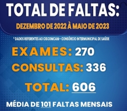 De dezembro a maio já foram 270 faltas a exames e 336 a consultas, numa média de 101 faltas por mês. Neste período foram agendados no Cis-Comcam 3.115 exames e 3.038 consultas, ou seja, as faltam representam cerca de 10%.