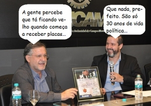 O clic é da reunião mensal da Acicam, quando o presidente Ben-Hur Berbet entregou placa de agradecimento ao prefeito Tauillo Tezelli. Foi pelo apoio da prefeitura à campanha Campo Mourão Cidade Natal. Segundo o texto da placa, a campanha ajudou o comércio local a vender cerca de R$ 50 milhões, com o envolvimento de mais de 200 empresas.
