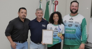 A atleta Gabriele Cristina dos Santos esteve nesta segunda-feira na Câmara de Campo Mourão. Foi receber o voto de louvor proposto pelo vereador Subtenente Macedo. Sete vereadores prestigiaram a entrega. A homenagem foi proposta após ela conquistar o primeiro lugar nos 10.000 metros na Copa Brasil de Marcha Atlética e garantir vaga no Pan-Americano da modalidade.