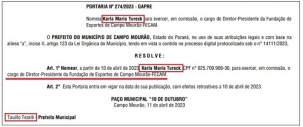 Foi publicada nesta terça-feira, no Órgão Oficial, a portaria com a nomeação de Karla Tureck como presidente da Fundação de Esportes de Campo Mourão. Muita gente estranhou, mas a filha do ex-prefeito Nelson Tureck chegou à administração de Tauillo Tezelli por indicação do secretário de Estado Márcio Nunes, que já havia se aproximado de Tureck nas eleições do ano passado, de quem, inclusive, teve apoio.