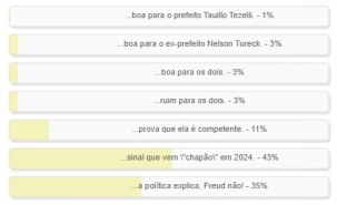 "A nomeação de Karla Tureck na Fecam é... sinal que vem chapão em 2024". Essa foi a alternativa mais votada em enquete de Boca Santa encerrada neste domingo. Teve 43% dos votos. Depois veio "A política explica, Freud não", com 35%. Já para 11% "é prova que ela é competente". O resultado completo está no quadro acima.