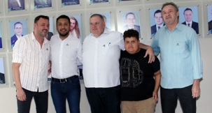 Os prefeitos Leandro de Oliveira (Araruna), Xandão Donato (Corumbataí do Sul) e Wilson Tureck (Luiziana) fizeram, sexta-feira, na Comcam, pose para foto com o deputado estadual Soldado Adriano José. Pudera. Os três indicaram o parlamentar como representante do município na Casa Civil do governo do Estado. O prefeito Neno Molina (Fênix) também fez indicação neste sentido.