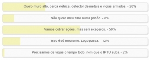 "Qual a sua opinião sobre a segurança nas escolas?" Enquete com esta pergunta foi encerrada neste domingo. "Vamos cobrar ações, mas sem exageros" venceu com 50% dos votos. "Quero muro alto, cerca elétrica, detector de metais e vigias armados" ficou em segundo, com 28%. Já para 12% "Isso é só modismo. Logo passa". O resultado completo está no quadro acima.