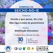 Campo Mourão - "Decida o que pensa, diz e faz" e "Não siga a onda do pessimismo" são as palestras que serão proferidas neste domingo (9h) na Seicho-no-ie. O preletor será Artur Masaki Kanada.