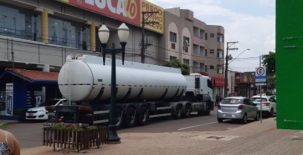 Carreta passa pela rua São Paulo, após cruzar a av. Capitão Índio Bandeira, no centro de Campo Mourão. Foi nesta segunda-feira. Foto: QITV