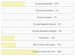 "Faltando oito meses para as eleições, você já tem ideia em quem vai votar?". Enquete foi esta pergunta foi encerrada neste domingo. Vitória da alternativa "Já sei em quem não votar", com 40%. Já 26% disseram estar definidos "só para presidente". Para 17% é "muito cedo ainda". Por outro lado, 15% já se definiram para tudo. O resultado completo está no quadro acima.