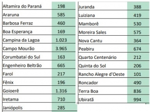 O governo do Estado publicou um balanço do primeiro mês de vacinação de crianças contra a covid-19. Dos 399 municípios do Paraná, 229 (57,4%) já vacinam a partir dos 5 anos sem comorbidades. Na região, Campo Mourão lidera, com 3.965 crianças vacinadas. Depois vêm Goioerê (1.316), Campina da Lagoa (1.023) e Ubiratã (994). Veja acima o quadro completo da região.