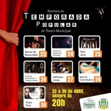 A Mostra Cultural realizada no mês passada foi só uma mostra mesmo. A Fundação Cultural de Campo Mourão prepara agora a abertura da Temporada Popular do Teatro Municipal. Serão sete dias com espetáculos com entrada franca. Começa no próximo sábado, sempre às 20h. Tem teatro, stand up, circo, dança e música.