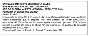 A publicação do Tribunal de Contas do Estado saiu nesta terça-feira. O município encerrou 2021 comprometende acima de 48,6% da receita corrente líquida com a folha de pagamento. Não estourou o limite de 54% da Lei de Responsabilidade Fiscal, mas já rendeu o alerta para o prefeito Rafael Bolacha.