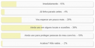 "Com o decreto que acabou com a obrigação, você parou de usar máscara?" Enquete foi encerrada neste domingo. Venceu a alternativa "Ainda uso em alguns locais e ocasiões", com 39%. "Vou esperar um pouco mais" teve 20% e "Ainda uso para proteger pessoas do meu convívio" 19%. O resultado completo está no quadro acima.