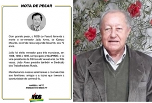 O presidente do MDB do Paraná, deputado Anibelli Neto, divulgou nota de pesar pela morte do ex-vereador João Alves, de Campo Mourão. Ele foi vereador por três mandatos, de 1988 a 2000, sempre pelo PMDB. O prefeito Tauillo Tezelli decretou luto oficial de três dias. "João Alves colaborou com dedicação com nosso município como líder político e também religioso”, destacou.