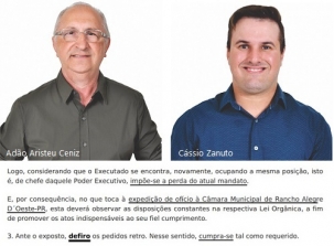 A juíza Lívia Simonin Scantamburlo, de Goioerê, confirmou nesta quarta-feira a perda do mandato do prefeito de Rancho Alegre do Oeste, Adão Aristeu Ceniz (PSDB).