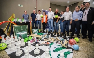 O governador Ratinho Jr entregou kits esportivos para 22 municípios durante a visita a Campo Mourão, nesta sexta-feira. Tudo dentro do programa "O Esporte que Queremos". Cada kit tem 35 itens e custa R$ 25 mil. A entrega incluiu cidades da região de Umuarama. Para a Comcam mesmo foram sete municípios beneficiados.