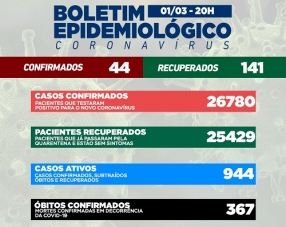 Quarenta e quatro casos de covid-19 foram confirmados nesta terça-feira em Campo Mourão. Os recuperados foram 141. Com isso, o número de casos ativos caiu para 944. Em 10 de fevereiro eram 2.901.