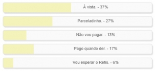 "Como você vai pagar o IPTU deste ano?" Enquete com esta pergunta foi encerrada neste domingo. Venceu a alternativa "À vista", com 37% dos votos. "Parceladinho" ficou em segundo, com 27%. Teve 17% que foram na opção "pago quando der" e 13% que disseram que não vão pagar o imposto. Já 5% preferem esperar o Refis.