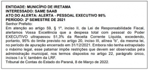 O município encerrou o segundo semestre do ano passado comprometendo acima de 51,3% da receita corrente líquida com a folha de pagamento. É o que diz publicação desta sexta-feira do Tribunal de Contas do Estado. O índice está abaixo do limite de Lei de Responsabilidade Fiscal (54%), mas já requer que medidas sejam adotadas.