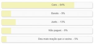 "Já pagou o IPTU deste ano? O que achou?" Enquete com esta pergunta foi encerrada neste domingo. Venceu, disparado, a alternativa "Caro". Teve 64% dos votos. Treze por cento acharam "justo". Teve 9% que achou "barato" e outros 9% foram na alternativa "não paguei". Já para 5% "deu mais reação que a vacina".