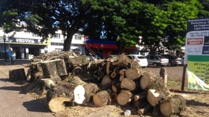 Rua Mato Grosso, esquina com av. Manoel Mendes de Camargo. A árvore foi cortadas e os tocos ficaram sobre a calçada, impedindo a passagem de pedestres.