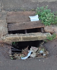 Bueiro com tampa de madeira na esquina da rua Tarumã com a João Vecchi.