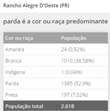 O maior percentual está em Rancho Alegre Oeste, com 52,9% se declarando pardo, contra 38,5% brancos.